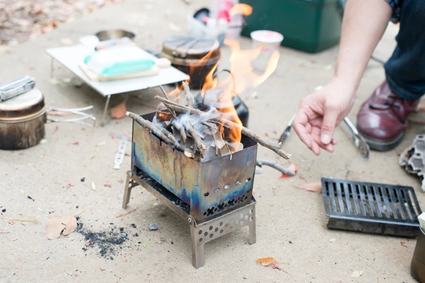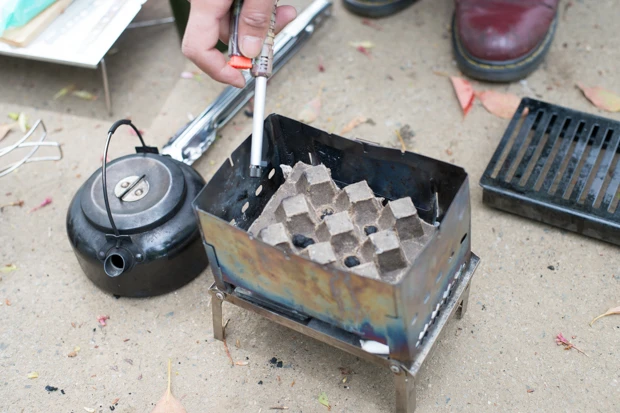 ヒロシ 俺は基本的にいろいろ買うのがイヤなんで、いつもは薪を集めていますが、今日は初心者でも手軽な炭を持ってきました。着火剤と一緒になってるんで、慣れてなくてもライターで簡単に着火できますよ。