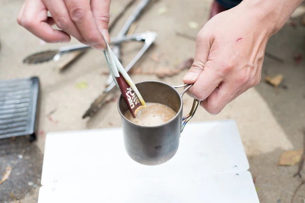ヒロシ この小さいテーブルはSOTOというメーカーの「フィールドホッパー」(5000円+税)という商品。パッと広げると自動的に足が出てくるんですよ。これも軽いし、折りたたむとA4の半分ぐらいに小さくなっていいでしょ! 野菜を切る時も便利だし、コーヒーカップとかちょっとした物も置けて気分的にも盛り上がります。こういうささやかなことが意外に大事で…。