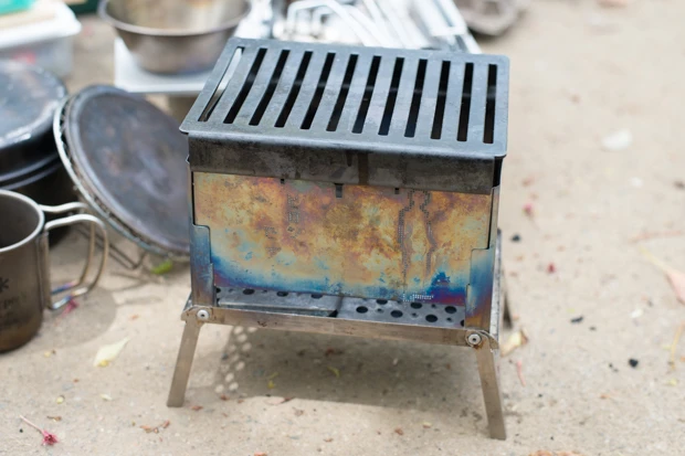 ヒロシ まずは、この「コンパクト焚き火グリル B-6君」(本体価格5076円・税込)に助けられていますね。コレ1台あればヤカンでお湯も沸かせるし、小さいようですが、男ふたり程度なら焼肉もこのサイズで十分です。そのへんの薪を拾って焚き火もできるし、眺めているだけでも十分です。