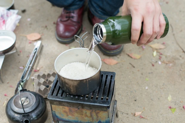 ヒロシ では米を炊きます。手軽にやるなら無洗米! 量は適当だけど、0.5合ぐらいをジップロックなどに小分けにして持ってきておけば、鍋に入れて水を足すだけで準備できます。ここで大事なのは吸水。水を入れて20分ぐらい置いておくだけで、成功率は全然違います。