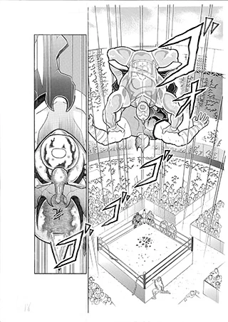 中井 これは僕も描く前にすごく長い時間をかけて、どういう構図が一番いいか考えたんですよ。というのも、この試合が始まった頃から最後の決め技はマッスル・スパークになりそうだというのは相棒からなんとなく聞いていたので、そう考えると期間的には2ヵ月くらい、このシーンをどうしようかと考えていたことになりますね。