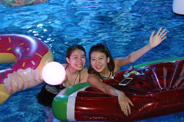 プール開き宣言で一斉に飛び込み、遊ぶ読者たち