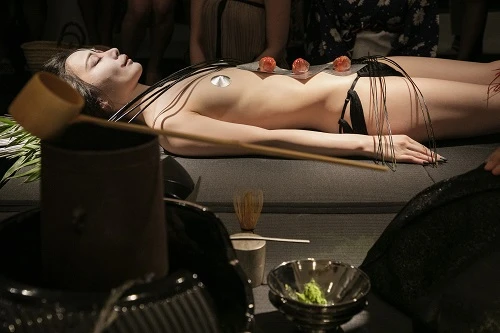 『茶会×怪談×NYOTAIMORI』をテーマに女性の身体に和菓子が載せられる