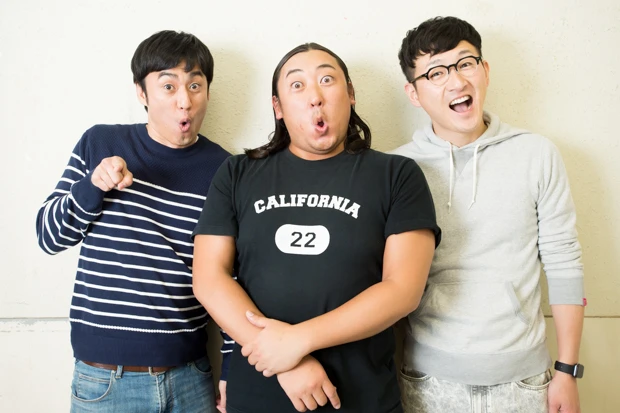 ふざけてツッコミの山本博を隠してしまうリーダーの秋山竜次(中央)。そして馬場裕之(右)。
