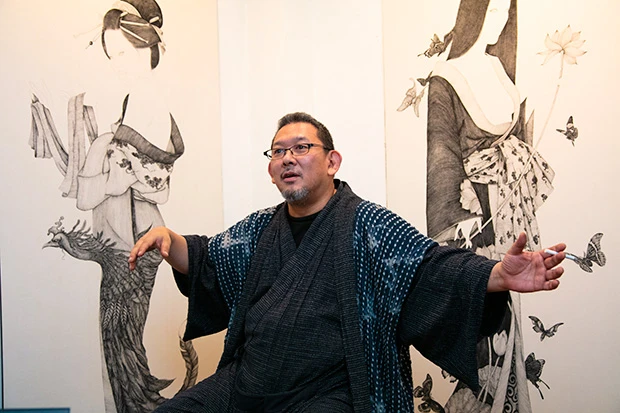 大阪の「劇団そとばこまち」って、生瀬勝久さんがいた劇団のセットの襖絵も僕、描いてるんです。なんか観に行った時、クソみたいな龍があって、あれあかんって、もう気になって芝居どころちゃうかった。俺が描くわって言うて。つい去年の話ですよ。