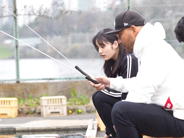 安藤 よろしくお願い......あ、来ました!(網を持ち出し、魚をすくい上げるさくちん。釣った後は池へリリース!)