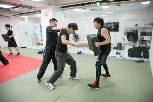 時折入る水分補給のインターバルは、砂漠のオアシスだ。息を整え、ハフハフ喘ぎながら、意地で立ち続けるドラゴン先生だが、すかさず残り20分からは護身の課題。こちらも半端ではないスピードでトレーニングが行なわれる。襲ってくるのはひとりとは限らず、前から後ろから、同時に襲ってくる相手を攻防一体でしとめなければ、こちらの命がないのだ。 ふたりに襲われたときの対処を交代で学ぶ。写真で岡村氏(右)はパッドを抱えているが、このときメインで練習している中央の受講者を前から襲っている役割だ。味方(左)が後方から攻撃しているときが、ほんの少しだけ体力回復のチャンス
