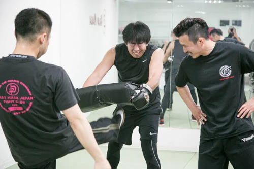 パッドめがけて全力キックの岡村氏(中央)。相手との距離感、体重の乗せ方etc...。単に右足を出せばいいのではなく、左半身をうまく使えてこそ、強烈な破壊力を込めることができるのだ