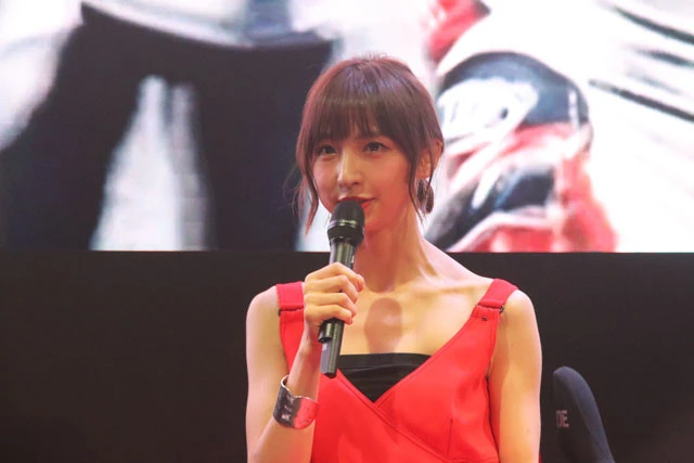 Audi e-tron Vision Gran Turisumoに乗った篠田。超高速走行に驚く様子が流されたまた、この日は富士スピードウェイで、日本人女性として初めて「Audi e-tron Vision Gran Turisumo」に同乗した篠田麻里子もトークショーに登壇。