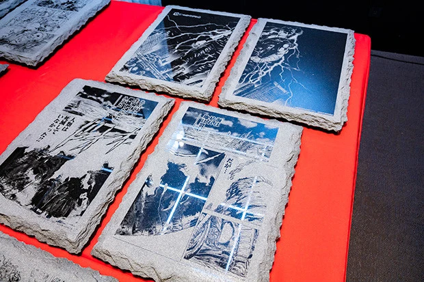 この日の"伝承式"は、まさに『北斗の拳』を1万年先まで遺る作品にすべく新たに製作された「石版」を初披露するという式典。登壇者3名を前に除幕され、初公開となった。