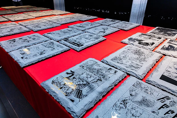 35年前に「週刊少年ジャンプ」に描かれた記念すべき『北斗の拳』連載第1話全48ページをそれぞれ約20kgの御影石の板にひとつずつ手作業で刻み、総重量約1トンの「新装版」として仕上げられた北斗の拳 石版