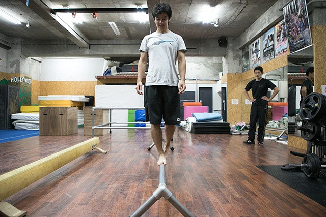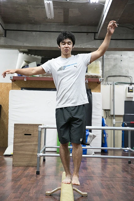 「次はこちらの平均台を......目を瞑って進みます。足の裏で台の面を感じながら。自分の体の軸を強く意識してください」