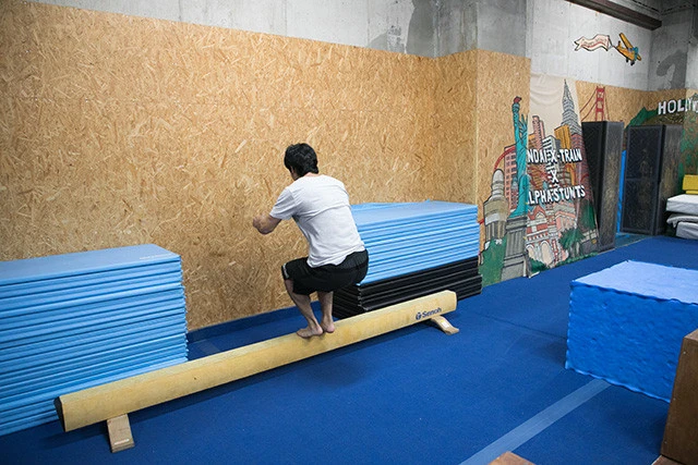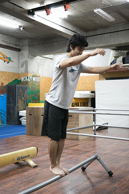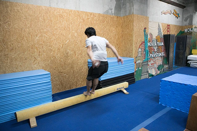 到着すると、早速佐藤によるパルクール講座が始まった。入念な準備運動のあと、出てきたのは一台のパイプと、平均台。