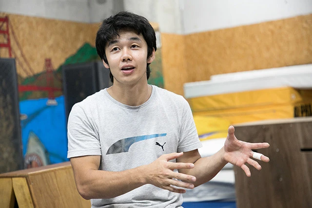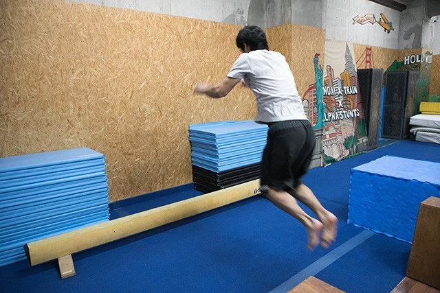 パルクール団体SENDAI X TRAINの東京支部、アルファスタントジム内にて。「現代の社会問題でもあると思うんですけど、子供が運動する場所や機会が減っていて、なおかつ正しい運動の仕方を見せられる大人も減っている。そういう現状に対して、パルクールを通じた視点を提示していきたいです」(佐藤)
