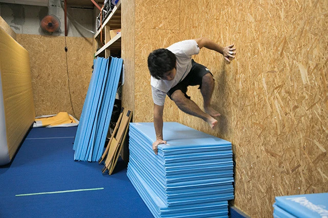 みっちり1時間以上汗を流したのち、佐藤が仕上げに指示したのは「疑似そり立つ壁」。壁に立てかけたマットを三角蹴りの要領で蹴上がり、天井近くの鉄製の突起に掴まるという練習である。