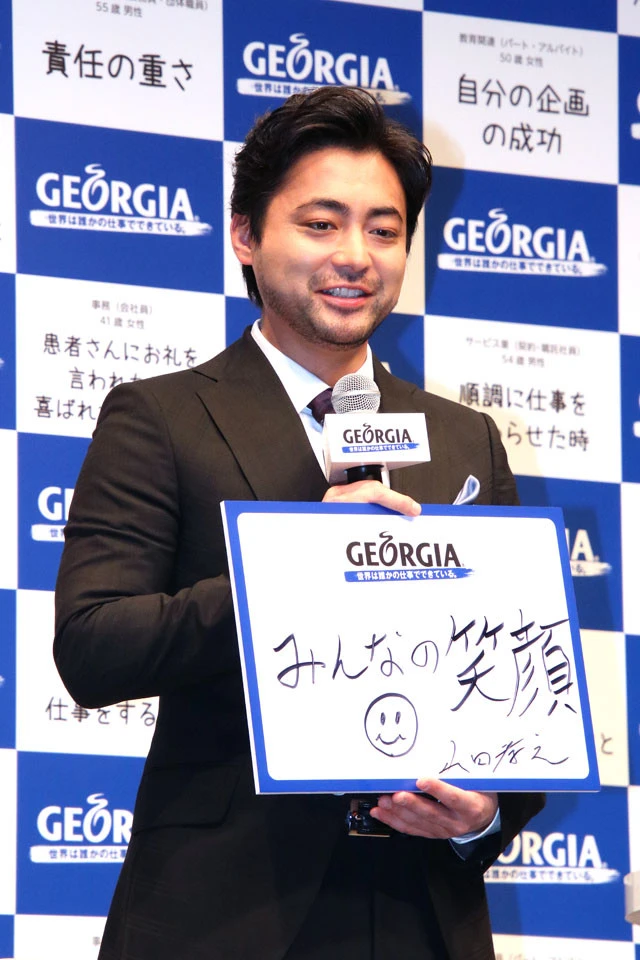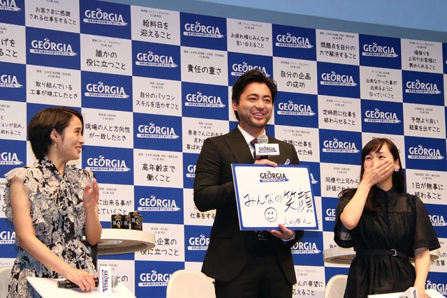 司会者から「そういうときにコーヒーがあれば」と助け船を出されると「そういうことです! コーヒーを飲めばニコニコしていますので。コーヒーでおだやかに、『よし、やるぞ!』という気持ちにコーヒーだけが、させてくれます。すごいものなんです」と立て続けにコーヒーを絶賛。さらに「ピリついた僕を笑顔にさせてくれる、それが『ジョージア』!」とキメ台詞で締めて共演者たちを笑わせた。