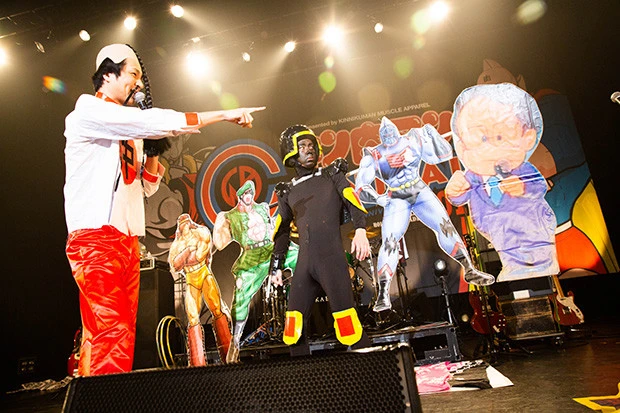 まずトップバッターの肉星球はいきなり各メンバー、ラーメンマン、ウォーズマン、テリーマン、そしてケンダマンのコスプレ姿で登場。その後もギター&小道具担当のまさやんが製作してきた3メートルはあろうかという巨大キン肉マン人形をダイブ気味に客席へ放り投げ、強制的に観客たちに40周年お祝い胴上げをさせるなど様々な仕掛けで攻め立てる!