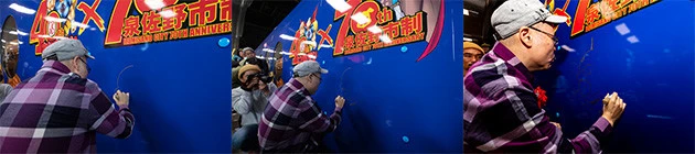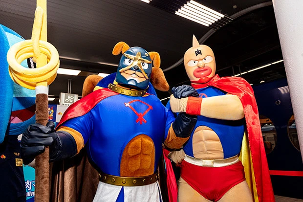 この日の式典にはゆでたまご原作担当・嶋田隆司&作画担当・中井義則の両先生の他に、大阪府・泉佐野市の千代松大耕(ちよまつ・ひろやす)市長、南海電鉄の佃吉朗営業推進室長、さらに泉佐野市の公認キャラクターであるイヌナキン&ゆるナキン、南海電鉄の公式マスコット・ラピートくん、そしてキン肉星よりキン肉マンことキン肉スグル氏も登場。ゆでたまご先生の一筆入魂の瞬間を見ようと集まった大勢のギャラリーを盛り上げた。