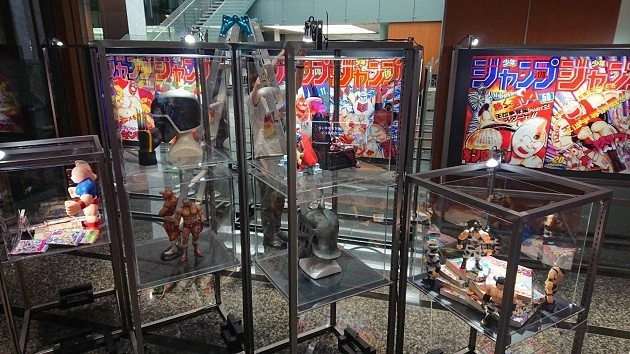 集英社「キン肉マン展示」の正面玄関。懐かしい表紙に、『週刊プレイボーイ』のキン肉マン号予告が並ぶ