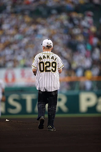 迎えた18時試合開始直前、タイガースのスターティングメンバーがひとりずつコールされ、その全員が守備位置についたところで、背番号029「NAKAI」の名前入り特製ユニホームを着た中井先生がベンチ脇の通路から登場。