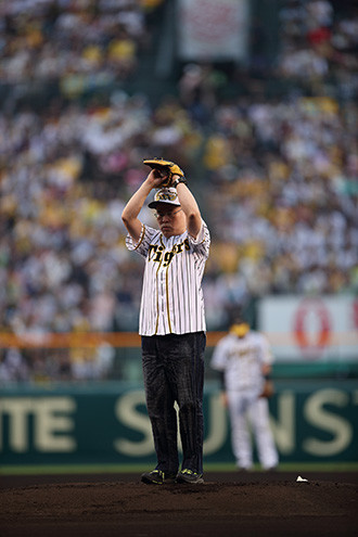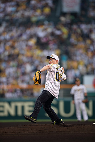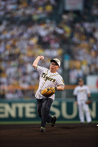 そのため、阪神タイガース主力選手たちとのコラボグッズ販売や入場者への特製うちわ配布、またアニメでキン肉マン役を務める神谷明氏による場内アナウンスなど、様々な"肉"三昧の趣向が凝らされた一戦となった。そのハイライトとして開催されたのが、ゆでたまご先生による試合前の始球式だ。