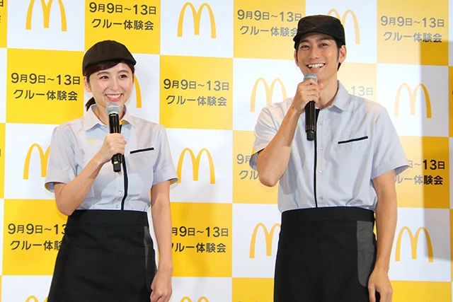 元テレビ朝日女子アナウンサーの宇賀なつみと俳優の平岡祐太が26日、都内で行なわれた「日本マクドナルド 2019年秋の『クルー体験会』記者発表」に出席した。かつてマクドナルドでアルバイトをしていた宇賀と平岡は、この日、初披露された新ユニホームに身を包み、当時を振り返った。