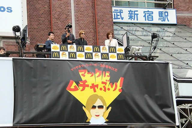 16日、X JAPANのYOSHIKIが、西武新宿駅前で行なわれた日本マクドナルド「てりやきマックバーガー30周年記念イベント」に出席。突然の登場に街の人々を驚かせた。