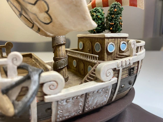 ゴーイングメリー号はほぼ初めての作品で、素材の知識もなかったため、粘土だけでなく木片も使われている。階段は別のジオラマ模型からちぎってきたそう