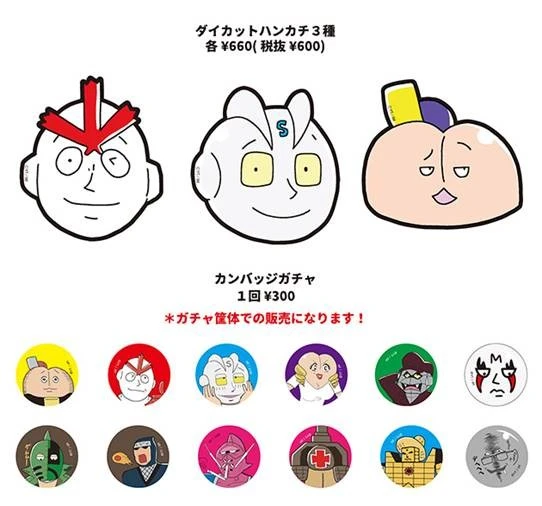 ダイカットハンカチ3種 各660円(税込)、カンバッジガチャ1回 300円