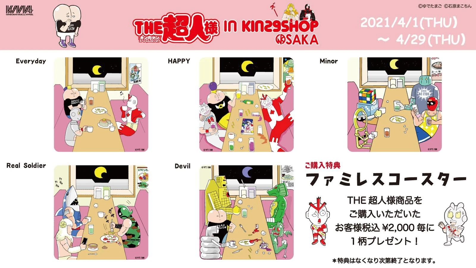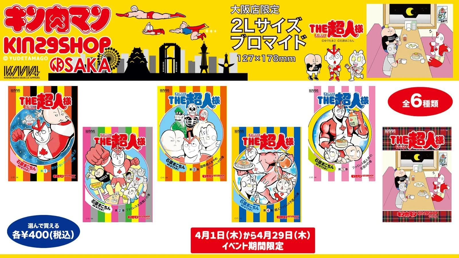 4月1日(木)から4月29日(木)までのおよそ一ヵ月、ゆでたまご先生が監修、石原まこちん先生が描いたキン肉マンスペシャルスピンオフ漫画『THE超人様』(2018年~20年に『週プレNEWS』にて連載)のイベント「THE超人様 IN KIN29SHOP OSAKA」が、大阪・心斎橋にある『キン肉マン』グッズショップ「キン肉マンKIN29SHOP OSAKA」にて開催されている。期間内に発売される限定グッズを一部ご紹介!!