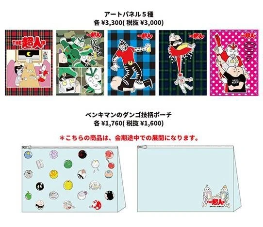 アートパネル5種 各3300円(税込)、ベンキマンのダンゴ技柄ポーチ 各1760円(税込)