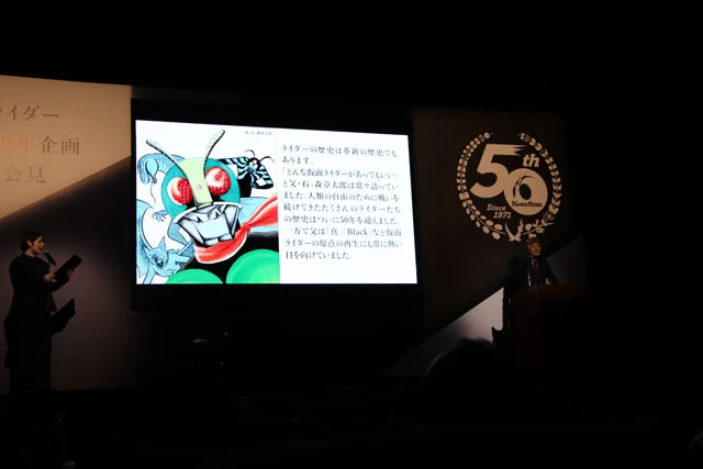 最初に壇上へ上がった東映の手塚治代表取締役社長は、50年の感謝とともにこの50周年を機に「これから新たなる時代に向けて、新たなる仮面ライダーの魅力を発信」することを宣言。「ショッカー風で悪い言い方ですけど、本当に人類みな等しく仮面ライダーをさらに楽しんでいただきたい」と意気込みを明かした。