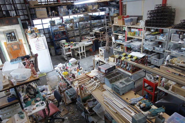 本作が生み出された撮影スタジオの各所には、撮影機材や人形たち、舞台セット用の材料が並ぶ。元は内装業時代の工房だったのを大改修した