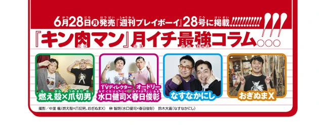 ●6月28日(月)発売『週刊プレイボーイ』28号には、「なすなかにしの「超人募集」漫談」の最新コラムを掲載!!