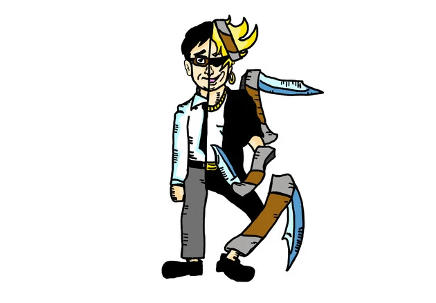 中西 K先生の本当の姿が、左半身のジャックナイフを装着した部分。つまり、ムチムチのエッロい女性を抱きかかえた夏祭りの邪悪なK先生こそが本来の姿だったわけです。
