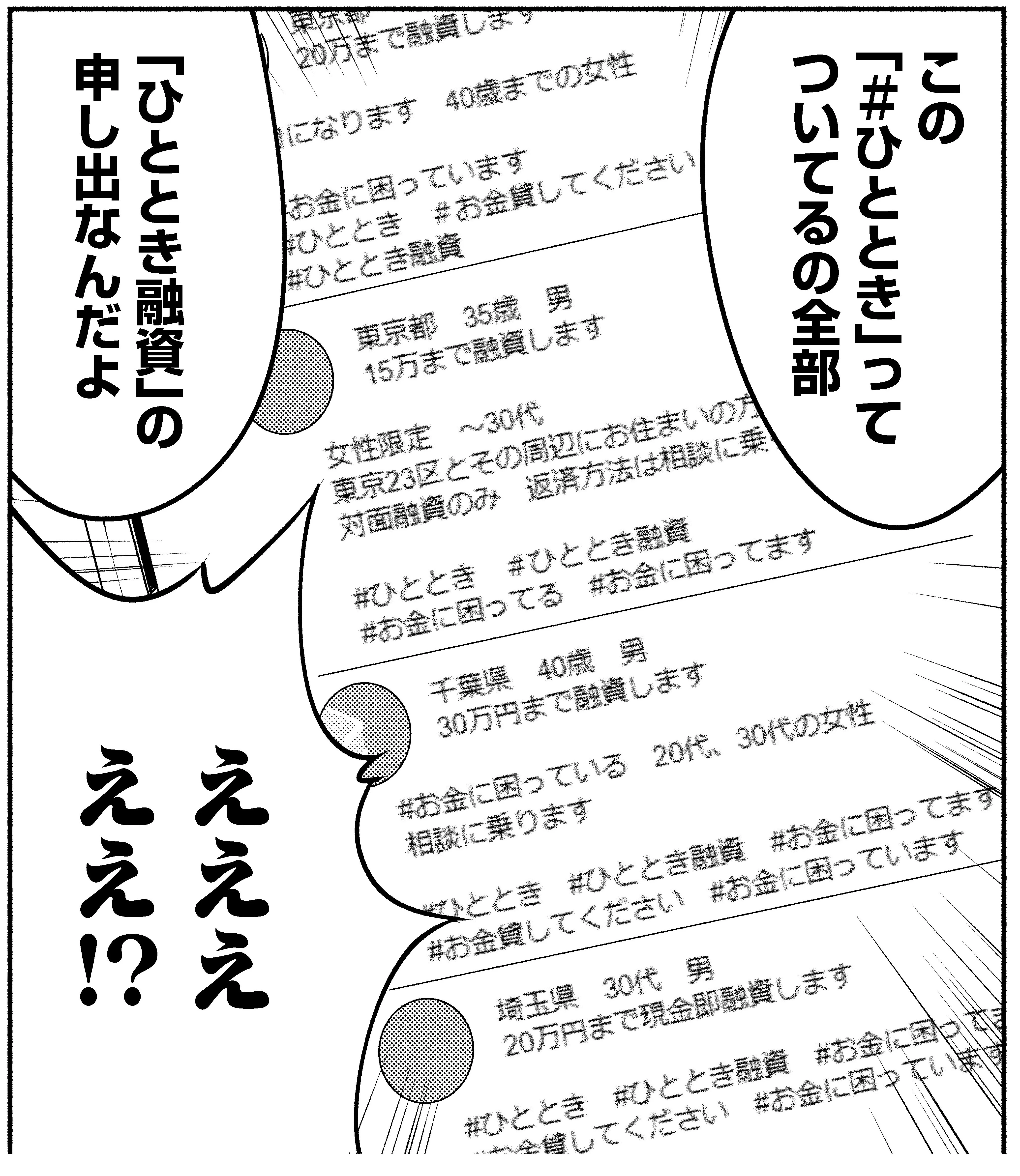 ――「#ひととき融資」でツイッター検索すると、「今週中に200必要です。助けてください」といった女性側のツイート、「18~30歳までの女性限定で支援します」といった男性側のツイートが山ほど出てきます......(苦笑)。