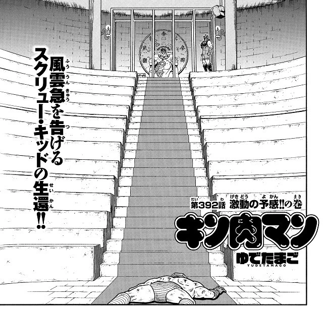 400話 最高の援軍!!の巻(12月4日分)超神vs超人のバベルの塔第6戦は、キン肉マンvsマグニフィセントに決定。キン肉マンの真の実力を図りたいと語るマグニフィセントは、リアル・ディールズから外れていた参謀ミートくんの招集を許可。最高の援軍を得たキン肉マンだが、師匠であるプリンス・カメハメに似た闘い方に大苦戦を強いられる