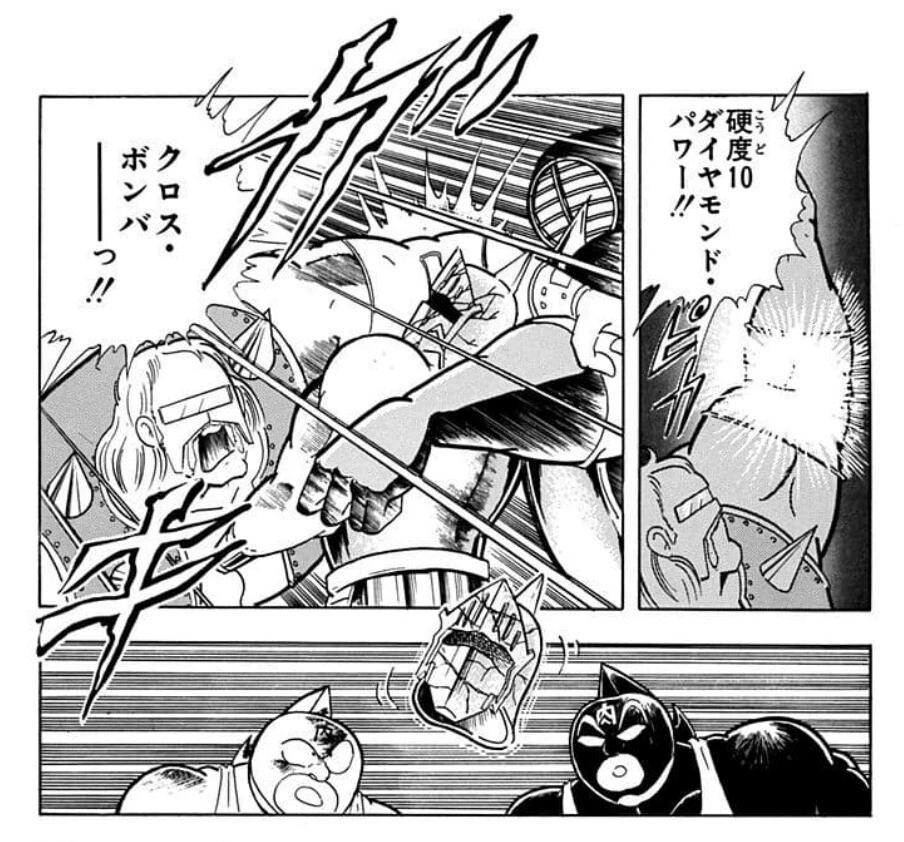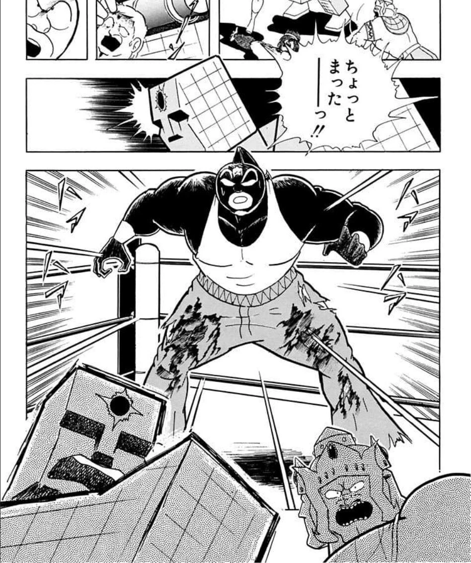 ロビンマスクの猛攻に冷や汗を見せる描写もあれば、激しく吐血することもある。それを思うと、何をやっても通用しなかった無敵の悪魔将軍と比べて付け入るスキが結構ある。神のようなオカルトじみた存在ではなく、あくまで同じ超人レスラーとしての一選手であるという枠組みは崩さない上で成り立っているボスキャラなんです。