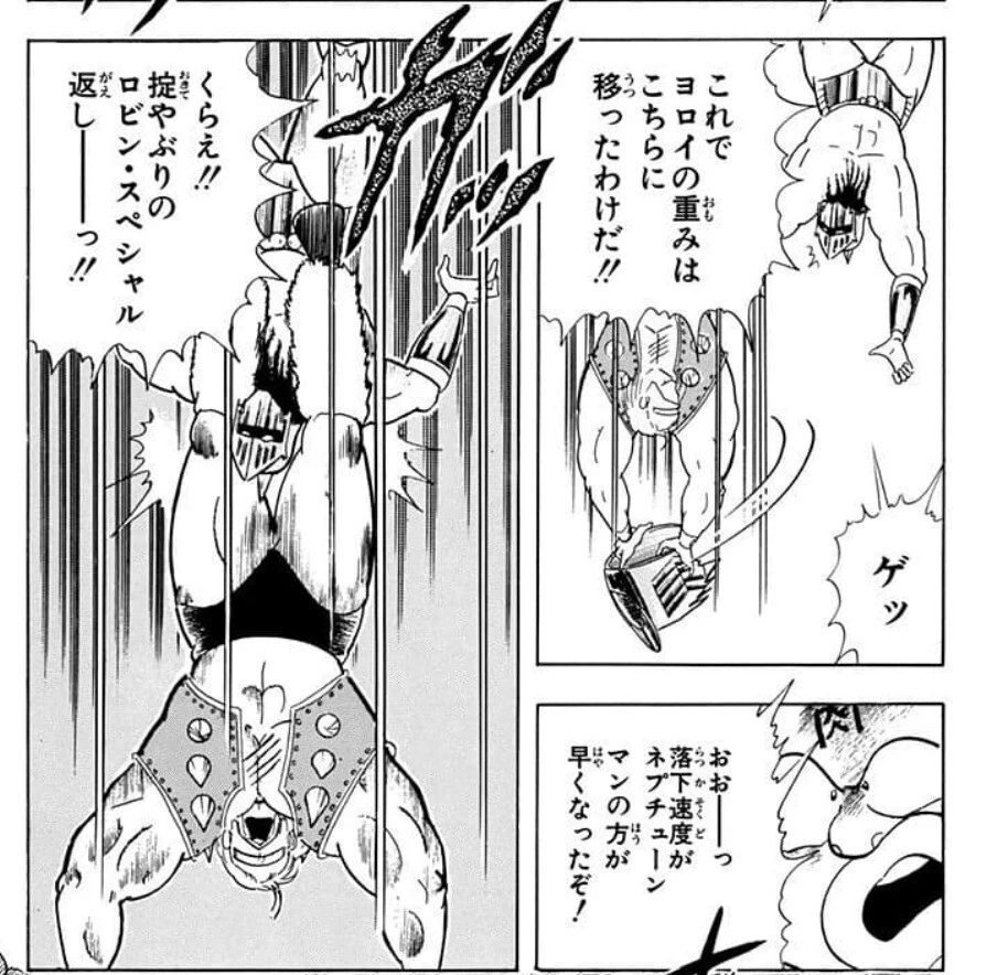 昔から「物理的にそうはならない」と、いわゆる"ゆで理論"の筆頭として語られることの多いこのロビン・スペシャル破りですが、子供だった僕はこの破り方に心の底から感心し、ネプチューンマンの智謀に恐怖したものです。だからこそ、簡単にこれを間違いだと一笑に付したくない!
