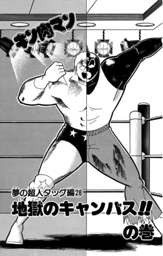 それでも、グレートはひたむきに奮闘を続けることで、キン肉マンとの新たな絆(きずな)を徐々に試合中に紡いでいく。こんな泥臭いことをあのテリーマンが正体を明かさないままやってのけていくカッコよさがたまりません! また、そういう巻であることを示すような収録第1話目「地獄のキャンバス!!の巻」の扉絵、縦半分にわかれてテリーマンとグレートの半身ずつが描かれた一枚絵がこれまた本当にカッコいい! 前巻冒頭のロビンマスクの一枚絵に引き続き、初っ端の1ページめからワクワクが止まらないこの点も本巻の魅力をさらに引き立たせてくれていると思います。