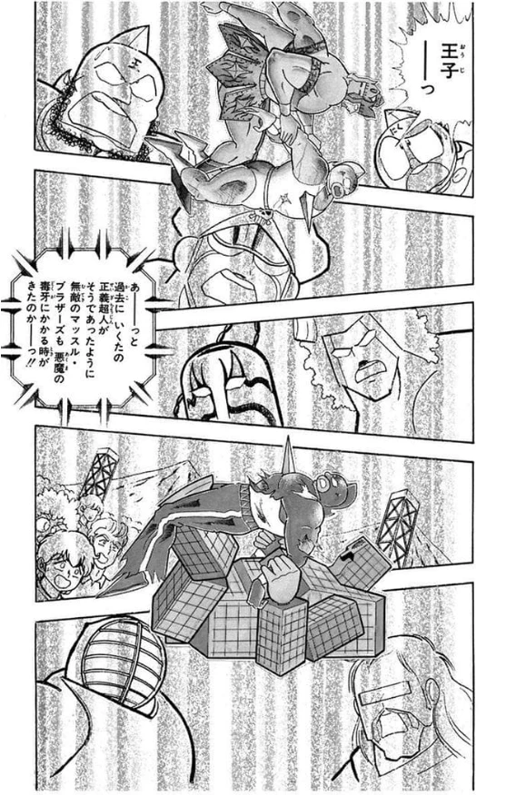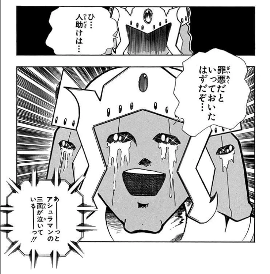こうして闘いの焦点は、友情の肯定と否定、まさに長年にわたる両軍のイデオロギーのぶつかりあいへと集束していき、その果てに出た最後の答えこそが、アシュラマンの命に関わるピンチを正義超人同様に身を挺して救ったサンシャインの最大の名言「悪魔にだって友情はあるんだーっ」。その行為はアシュラマンの心にまで異変を起こし、隠されていた彼の素顔、涙の三面がついに姿を見せるのです。