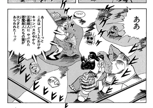 僕が密かに大好きなのがマッスル・ローリングというタッグ技。「地獄のキャンバス」という悪魔霊術で現れた悪魔の亡霊たちに対し、生身の肉体ではなすすべなしと思われていたところ、この技だけはなぜか有効。次々と亡霊をキャンバスへと押し戻していきます。しかしパワー抜群の魔雲天にだけはこの技も止められた!? どうするかと思われたふたりの答えは「かまわんこのまま回転だーっ」でした。結局、それで魔雲天もあっさり潰されこの危機から完全脱出。勢いで乗り切る強さを学べる隠れた大技だと思います。