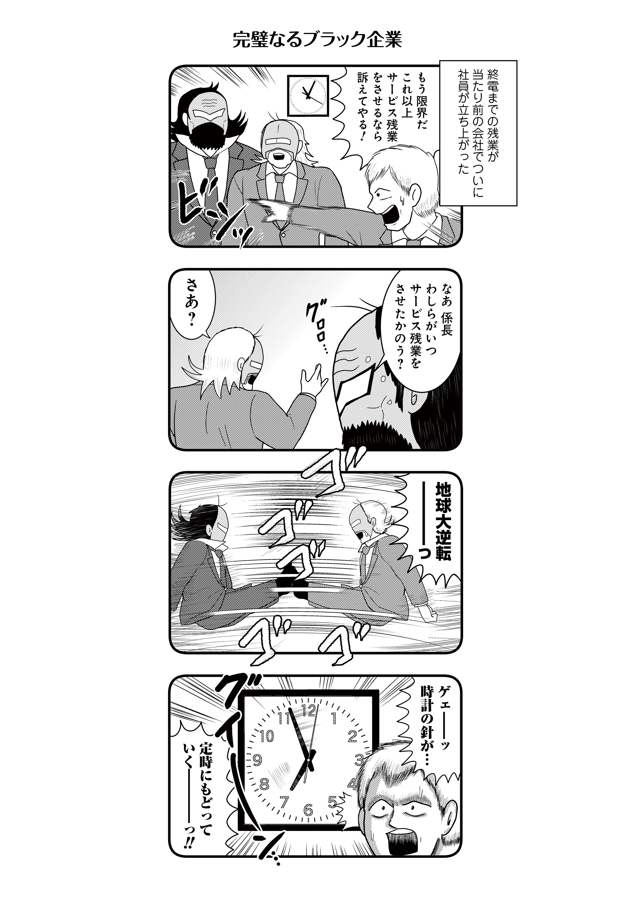 こうして初めてマスク狩り予告を未遂に終えて失敗した、と思われた完璧超人組ですが不思議なことに、失敗などしていないと彼らは言い張るのです。果たしてどういうことなのか。答えは「時間を予告前に戻せば失敗したことにはならない」。これがもしクイズならこんな正解、誰ひとりたどり着くことはできません。しかしゆでたまご先生、いや、その意思を体現するヘル・ミッショネルズはやってのけます。地球の自転を力技で逆回転させ、太陽の位置を戻すというその名も「地球大逆転」。あまりにも豪快!