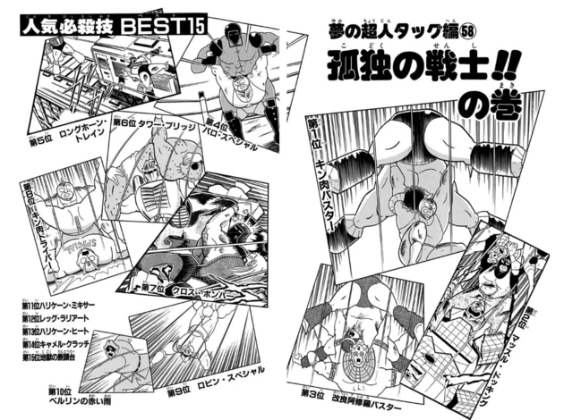 この巻の中ほどで発表されている「人気必殺技BEST15」というコーナー。読者にとってのお楽しみということで、あえて過去の名場面の再掲載ではなく新規描きおろしの技イラストもあってとても豪華なのですが、気になったのは第8位。描きおろしのキン肉ドライバーを食らう相手がなぜか、対戦経験などないはずのスペシャルマンに!? 他の技は全て実際の名場面からの抜粋なのになぜここだけ!? このシリーズにおける彼の境遇の悪さが本当に気の毒でなりません......