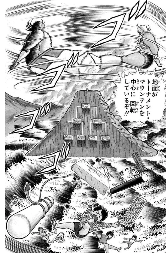 この肉世界においては、耐性がついて並大抵のことで驚かなくなっていた僕ですら、これにはぶちのめされました。見逃せないのはこの大技の最中の演出、リング上のキン肉マンたちから見た観客席はこの大異変に地獄絵図と化しているのに、実際に観客席にいる人たちは何も異変を感じていないというSFにも似た構図です。地球の自転を逆転させるという発想の突き抜け方もさることながら、こういう常識を超えた演出をその上に塗り重ねることで、本来なら無理筋に思えるゆでたまご先生の常識破りの発想は不思議な納得感を得たようにも思えます。要は嘘をただの嘘で終わらせない。嘘をつくなら読み手の心揺さぶる驚きのもうひと演出を必ずそこに付け加え、読者を意地でも感心させる。いわゆる"ゆで理論"が次々と生み出されてきた最大の秘訣は、この無限に広がっていく発想力の波状攻勢にあるのではないか、と僕はいつも本気で感心させられてしまうのです。