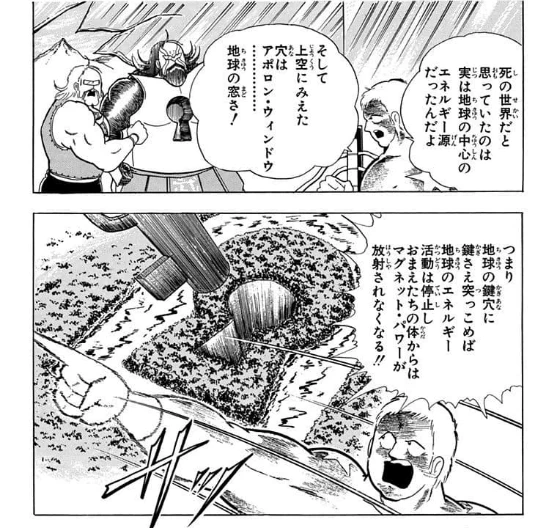 そんな物語の最終盤、完璧超人の胸に浮かび上がった鍵穴状のアザは何ぞやというミステリーパートと、肉体をぶつけ合う激しい格闘パートが同時並行で進んでいくわけですが、その末にテリーマンが発した「それじゃ謎解きといこうか...」から始まる"アポロン・ウィンドウ=地球の鍵穴=これこそが完璧超人のパワー源だ"という徹底解説。単純な肉体同士の闘いだけで試合が決着していくのではなく、会話パートでもうひとつのまったく別の闘いが同じリング上で進行していくこの流れもまた『キン肉マン』ならではのよくばりセット。試合展開の特徴だと思います。