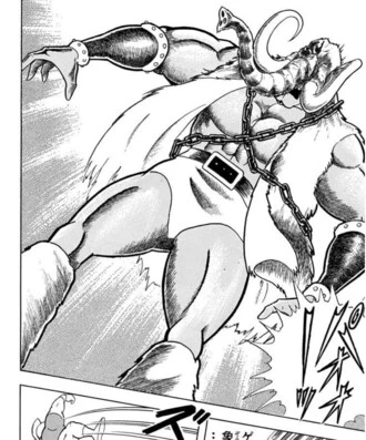 そんな形で大事な戴冠式の最中に突然やってきた謎の五人を排除しようとキン肉マンは勇ましく突撃していきますが、そこでそのキン肉マンの突進をショルダータックル一発でバーン!と跳ね返したのはなんと、その五王子以外の新たな超人!? これぞまさに作中全体を通して僕の最も好きな超人のひとり、マンモスマンの初登場シーンです!