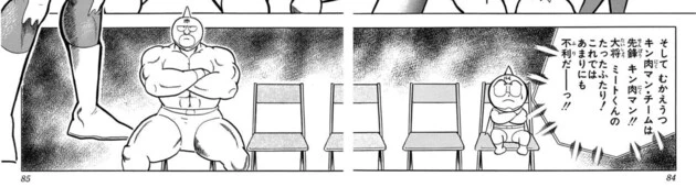 それに対してキン肉マンは、様々な事情でテリーマンやロビンマスクといったこれまでの仲間の助力を得ることはできず、ミートとふたりだけでこの壮大な闘いに挑むという圧倒的不利。冒頭でも述べました、ゆでたまご先生自身による徹底的なキン肉マン潰しの姿勢がこうして牙を剥き、最強のキン肉マンをもってしても読者が不安にならざるをえない状況がこうして見事に作り出されてしまいました。