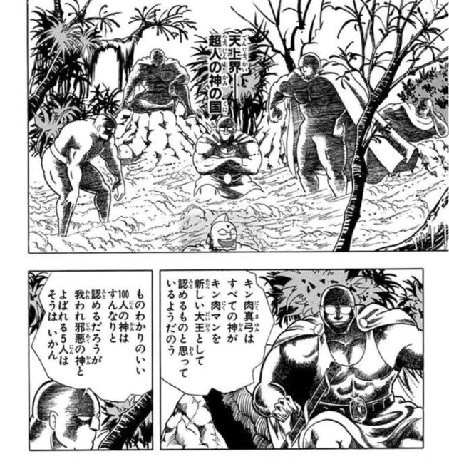 少しメタ的な視点になりますが、フィクション作品の世界内における究極の神とは、実は作者です。今のキン肉マンの成長ぶりは、その作者にすら手に負えないところまで高まってきている。このままでは主人公があまりに強すぎて、作品内の緊張感も薄れてしまいかねない。じゃあこの先、キン肉マンをどうしよう? そんなゆでたまご先生の大いなる苦悩を、作者という究極の神に比肩しうる作中の存在=邪悪神たちは代弁してるんじゃないか。