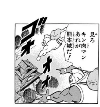 目立たないんですが、僕が大好きなのがこの一コマ。飛行機から同時にパラシュートで熊本城へと降下していく最中「見ろキン肉マン、あれが熊本城だ!」とマリポーサがキン肉マンにかけたこの一言。これから命のやりとりをしようという相手に、なんと親切で紳士的な態度でしょうか。このマリポーサという男、他の場面でもことあるごとに仲間から信頼を示されるなど随所に品格の高さが伺え、キン肉マンには悪いけど彼が王になった世界も見てみたい、ともつい思ってしまいます。
